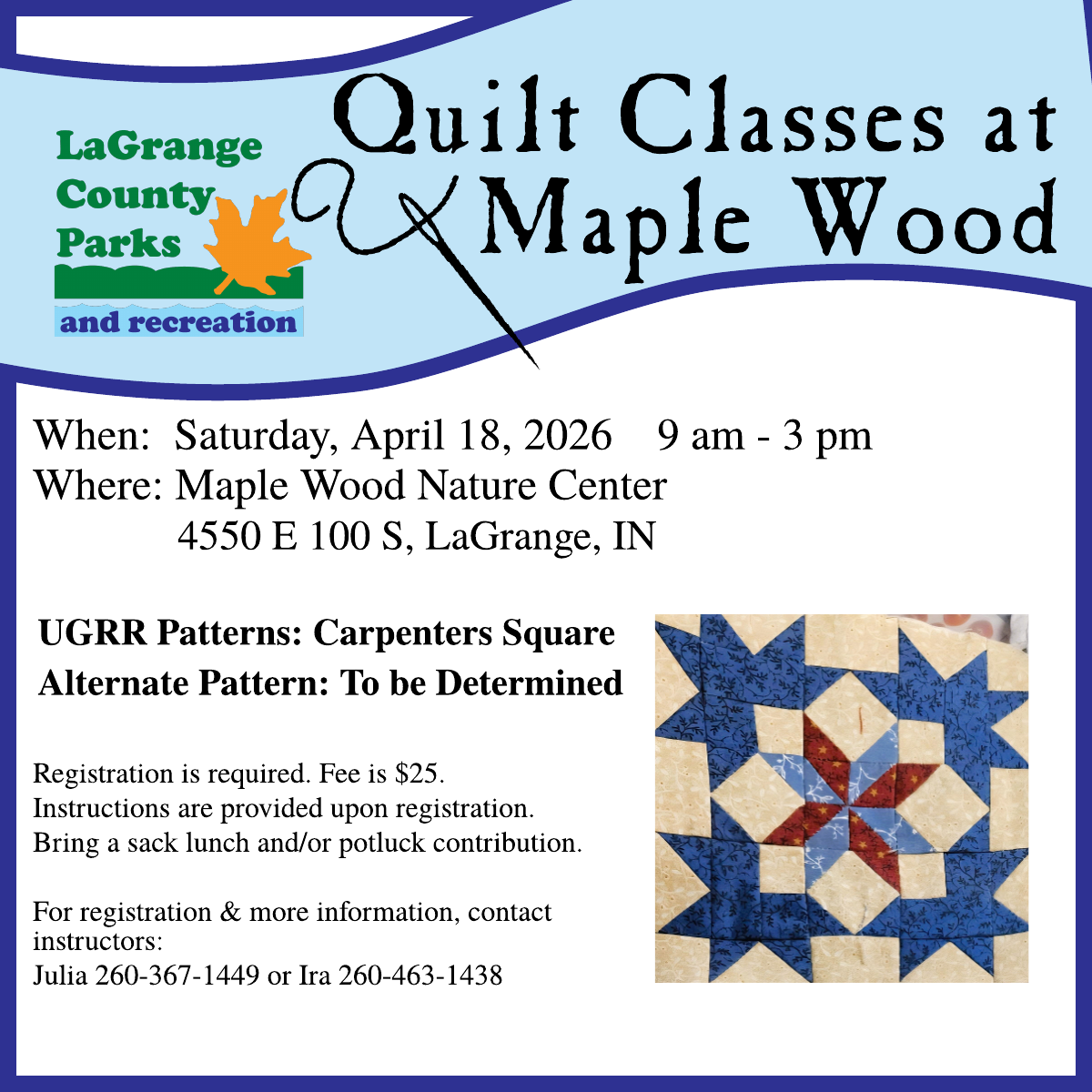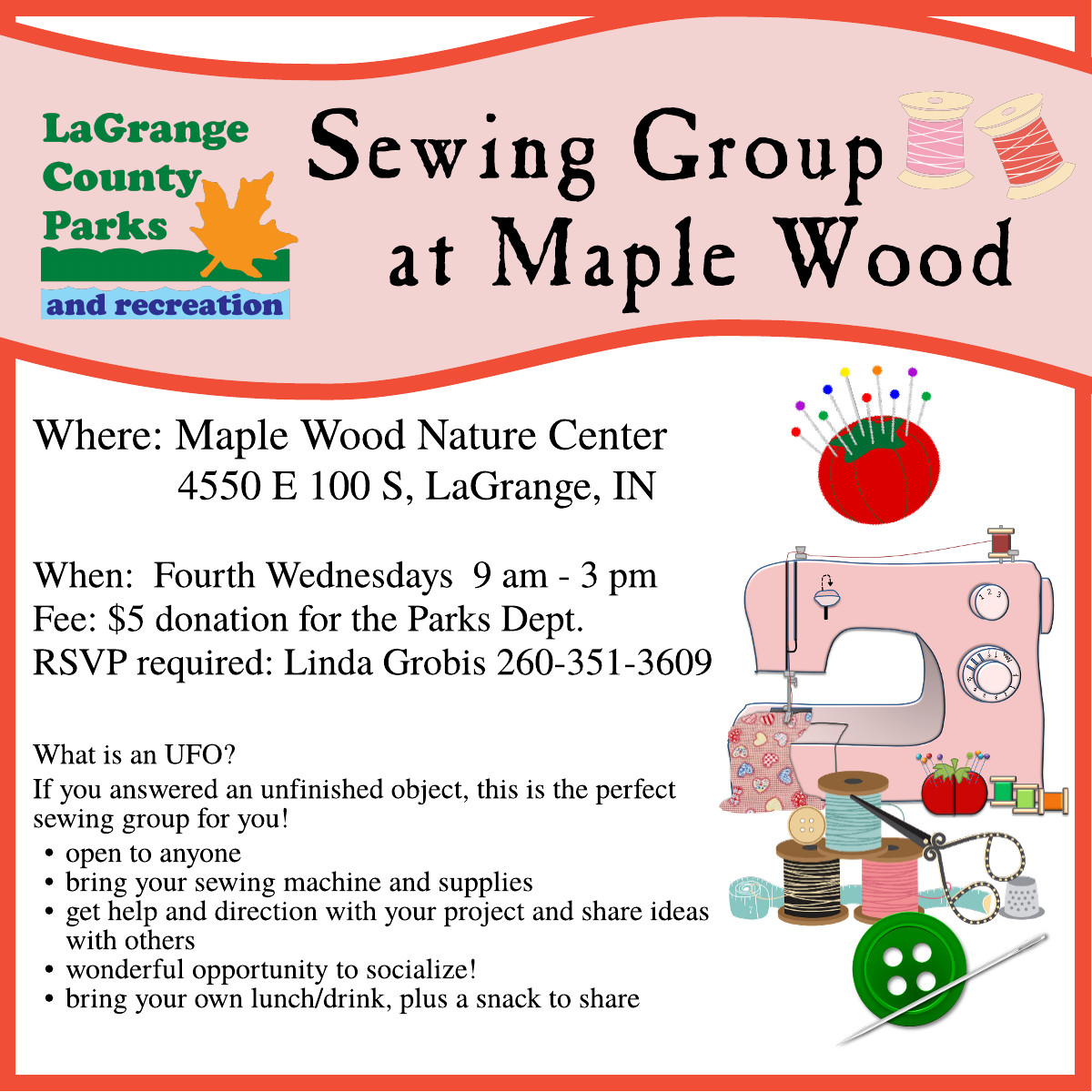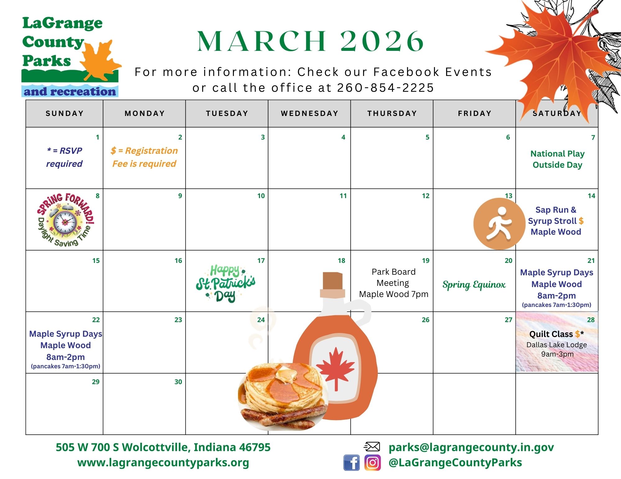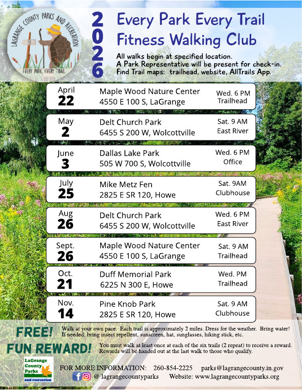 For additional information about park events and programs, or to schedule a program for your classroom, organization, or group, please contact Parks Office at 260-854-2225 or parks@lagrangecounty.in.gov.