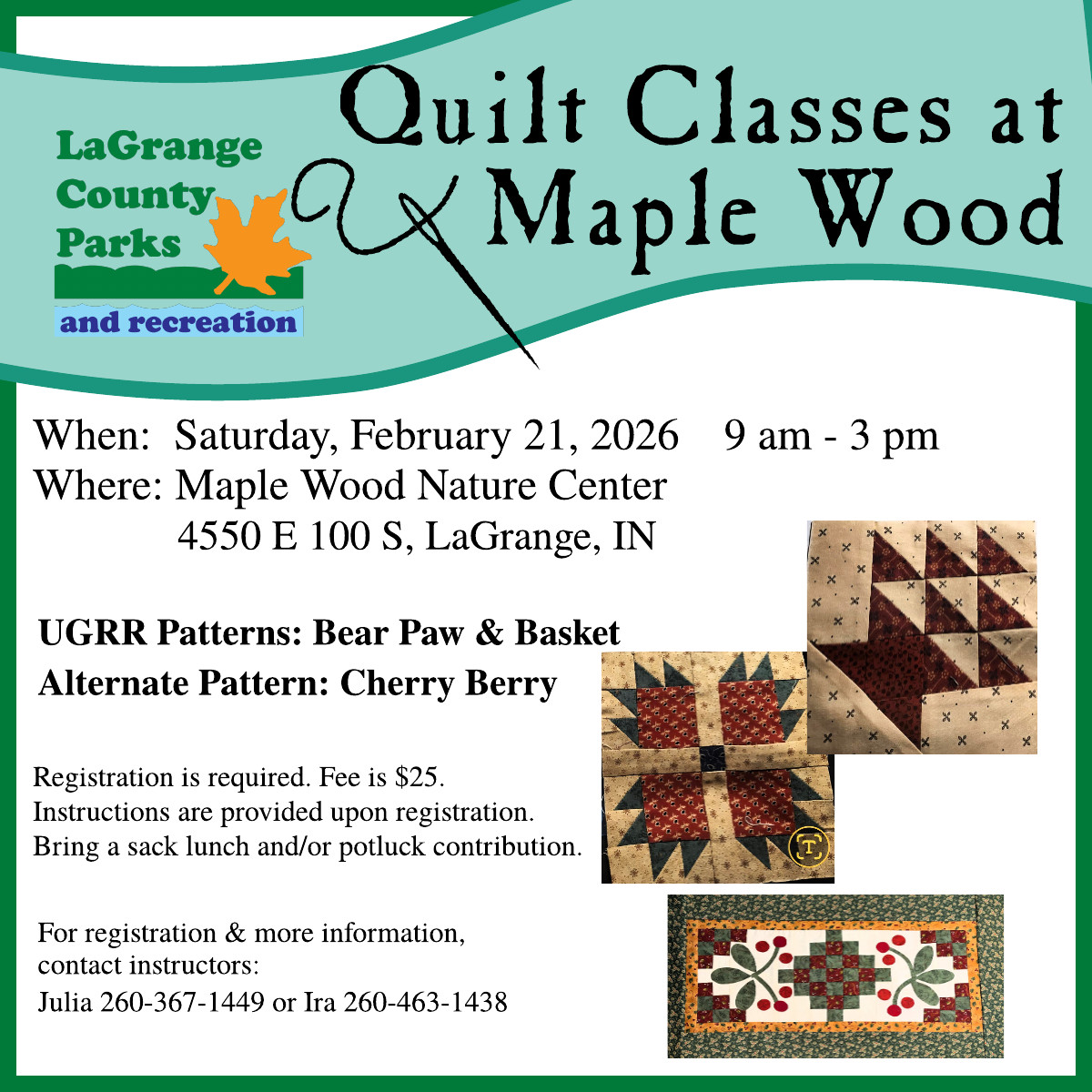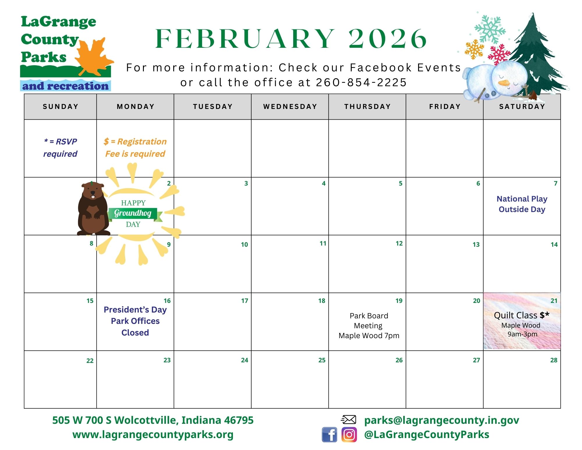 For additional information about park events and programs, or to schedule a program for your classroom, organization, or group, please contact Parks Office at 260-854-2225 or parks@lagrangecounty.in.gov.